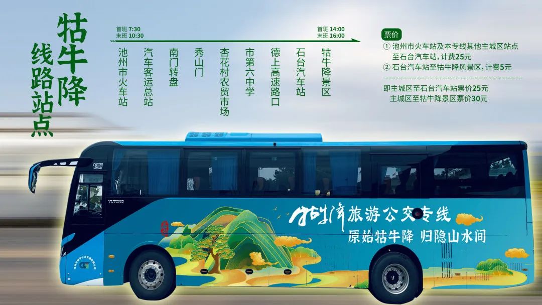 11月1日,池州主城區(qū)環(huán)城旅游公交線路和池州高鐵站至牯牛降景區(qū)旅游直通專線正式開通。環(huán)城公交線路全長約35公里,配備4臺新能源純電動公交車,采取環(huán)線運(yùn)營模式,途徑杏花村、平天湖、齊山、百牙塔、天堂湖公園等特色景區(qū)景點(diǎn)?;疖囌局陵襞=稻皡^(qū)旅游直通專線全長100公里,沿線設(shè)置9個停靠點(diǎn),采用循環(huán)發(fā)車模式,旅客可直接“打卡”牯牛降景區(qū),暢游石臺享受美好“硒”生活。